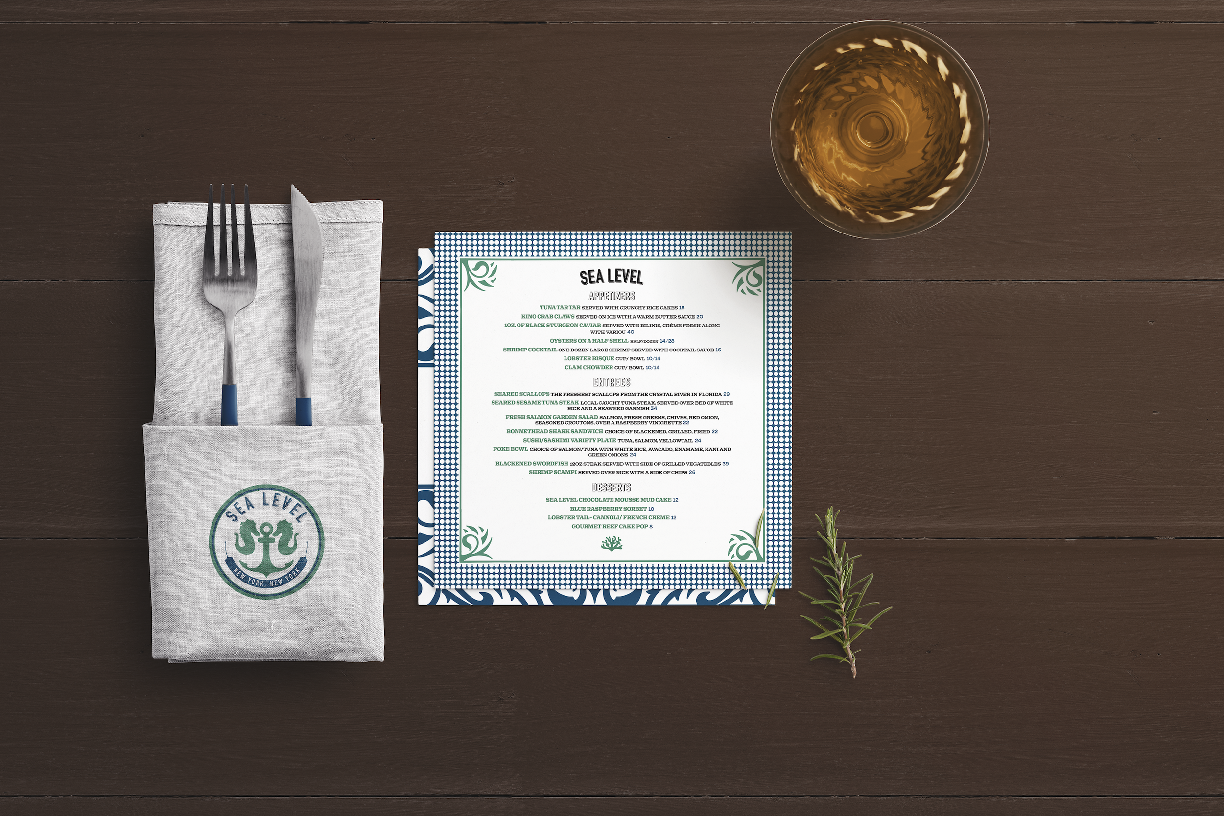 When branding Sea Level, it was essential for me to maintain a cohesive and refined visual identity while incorporating a variety of design elements. Patterns played a key role in adding depth and personality, but to ensure compatibility, I relied heavily on my color palette. The rich ocean blue and soft seafoam green not only reflect the restaurant’s connection to the sea but also create a sense of sophistication that complements the upscale dining experience, similar to the food we serve. These colors, when combined with elegant typography and thoughtfully designed logos, establish a strong, recognizable brand presence. On the menu, the interplay between the patterns, colors, and clean layout enhances legibility while reinforcing the restaurant’s identity.